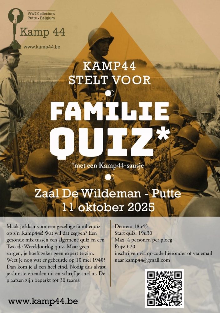 Op 11 oktober organizeren wij een gezellige familiequiz met een kamp44 tint. Een quiz met algemene vragen, maar waarin ook WOII vragen niet in ontbreken. Schrijf u tijdig in, de plaatsen zijn beperkt. Inschrijven kan u hier. Meer info hieronder op de flyer.